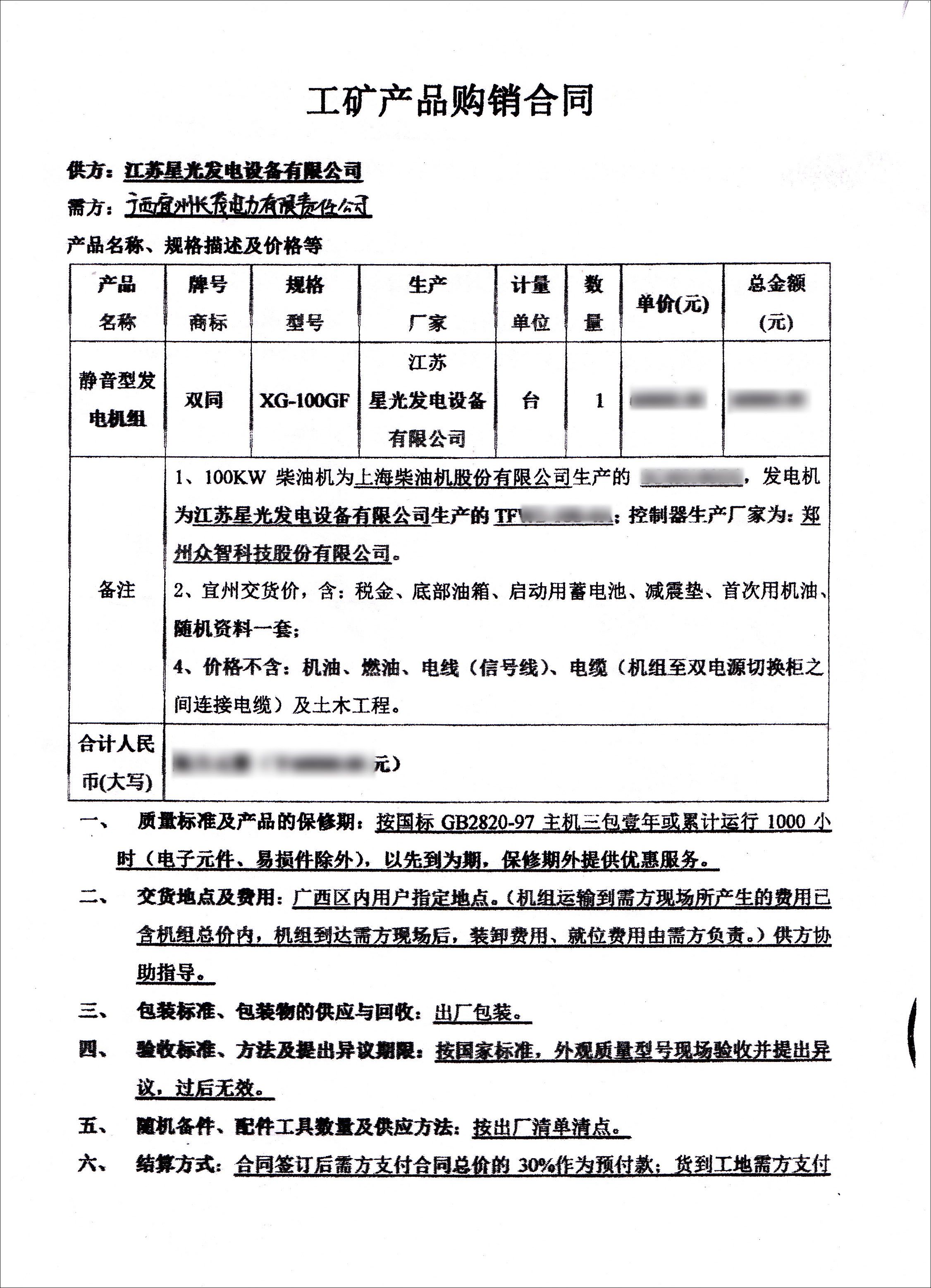 6月10日,广西宜州长茂电力公司(主要经营电力投资开发、电力检修、建筑材料销售等)在我公司采购一台配置为上柴发动机配星光发电机的100KW静音型上柴发电机组。我公司将按合同规定为其提供优质的产品和服务,绝不以次充好,建立用户档案,可定期或随时上门为机组进行检查、保养及维修,以及时消除机组隐患,保证机组处于最佳运行状态。更多发电机详情欢迎拨打星光热线:13878198542