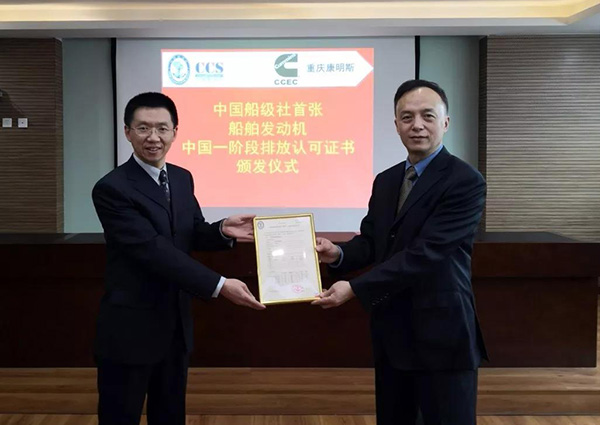 中国船级社颁发国内首份船舶发动机中国第一阶段排放认可证书