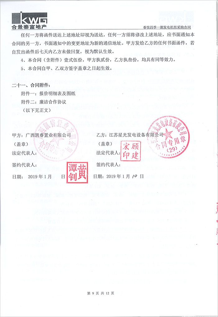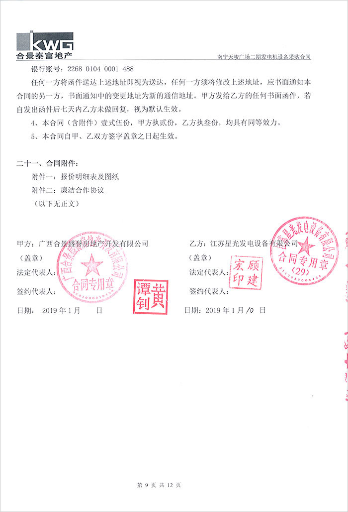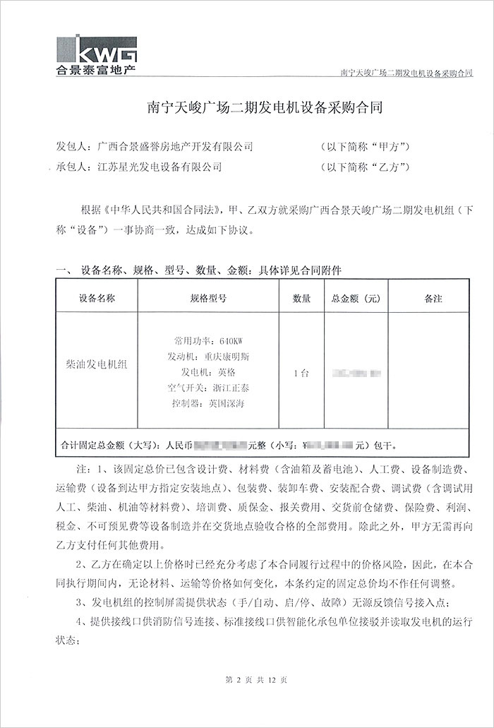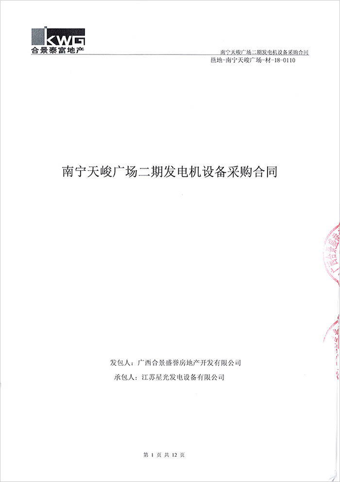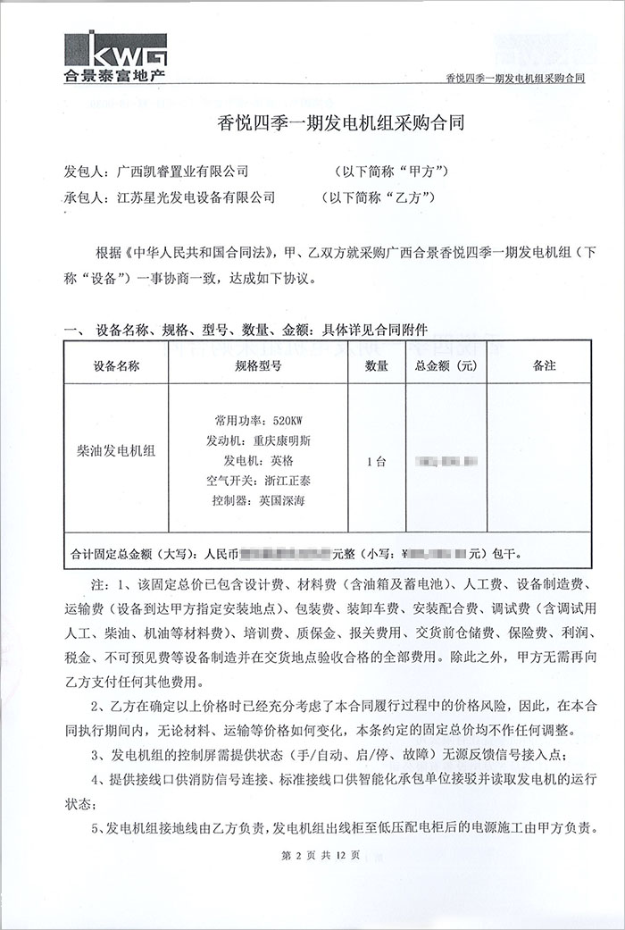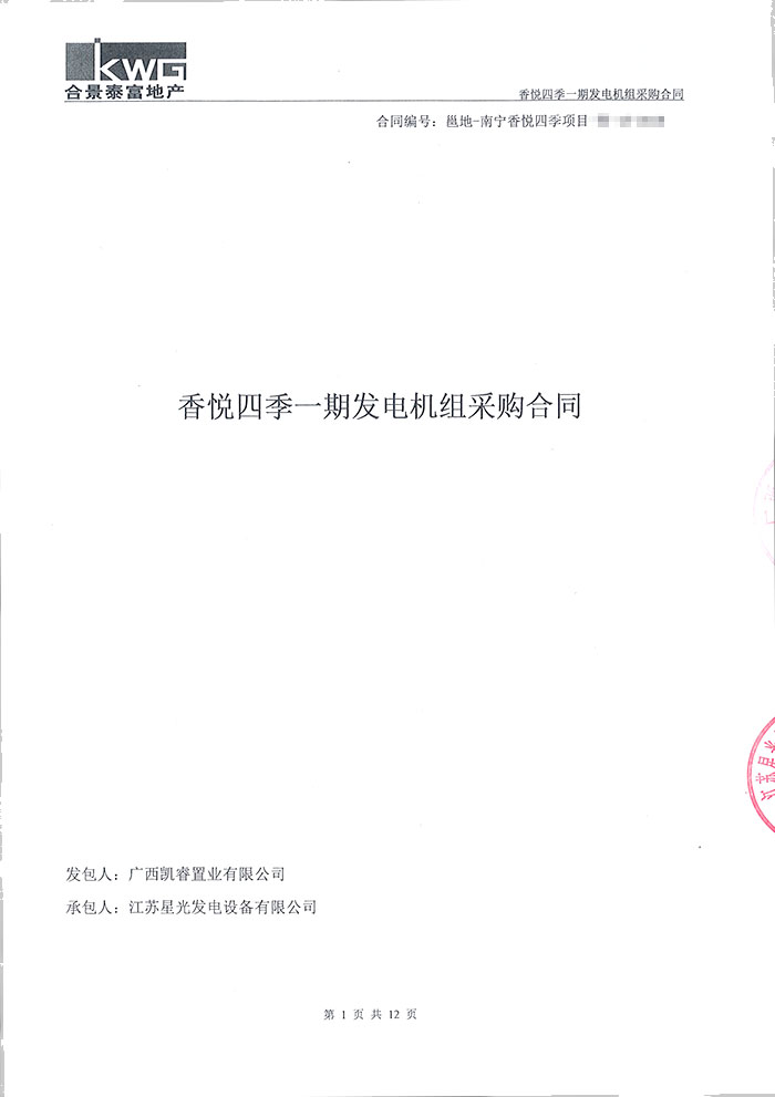 近期,我公司和合景泰富旗下子公司广西合景盛誉房地产开发有限公司以及广西凯睿置业有限公司分别签订一台640KW重庆康明斯发电机组、一台520KW重庆康明斯发电机组,分别用于南宁香悦四季一期、南宁天峻广场二期应急备用电源。