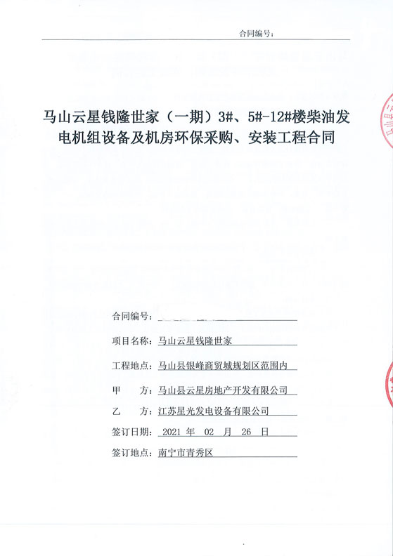 江苏星光是云星集团长达十六年的合作伙伴,自2005年起,便与其保持友好合作关系,其在星光公司购买的柴油发电机组达十五台左右,星光发电机的良好性能以及优质售后服务获得了广大用户好评。非常感谢马山云星钱隆世家一期项目再次选择星光公司作为供应商,也感谢云星集团及其子公司马山县云星房地产开发公司对星光公司的认可!