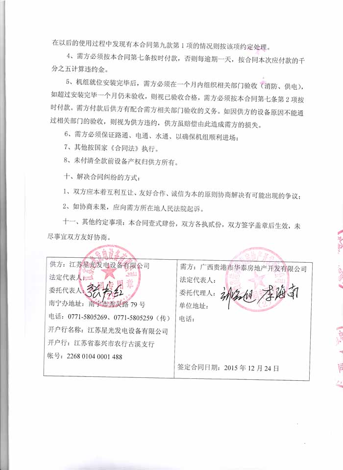 2015年12月24日,广西贵港市华泰房地产开发有限公司与我公司签订了柴油发电机组产品购销合同,我公司为其提供了550KW上柴柴油发电机组一台。发电机产品购销合同如下: