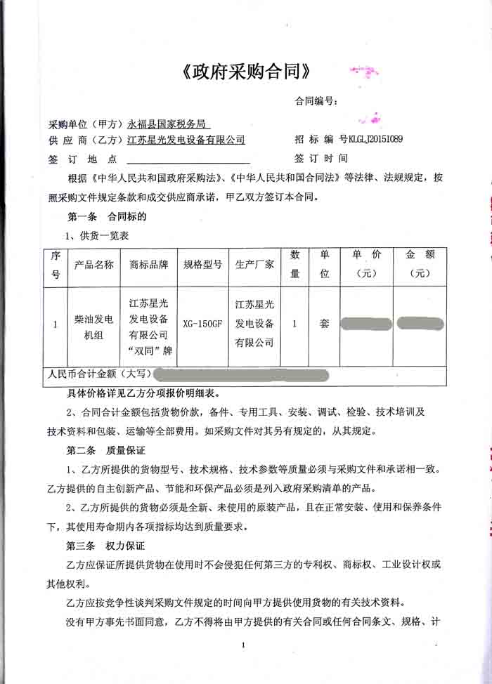 2015年12月28日,广西永福县国家税务局与我公司签订了150KW发电机组购销合同,我公司为其提供里卡多柴油发电机配星光发电机的柴油发电机组一台。江苏星光动力集团自成立以来就以技术创新为己任,设计生产的柴油发电机组一直在同行业中遥遥领先,得到各种外界人士的认可。发电机产品购销合同如下:
