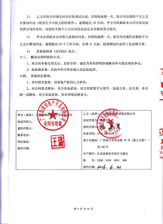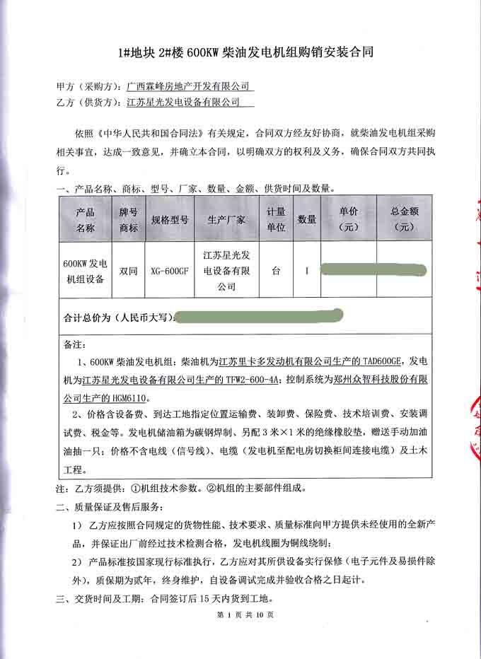 2016年6月21日,我星光公司与广西霖峰房地产开发有限公司签订1#块地2#楼 600KW柴油发电机组购销安装合同,我公司为其提供机组配置为江苏里卡多发动机配星光发电机及郑州众智控制器的发电机组一台。发电机产品购销合同如下: