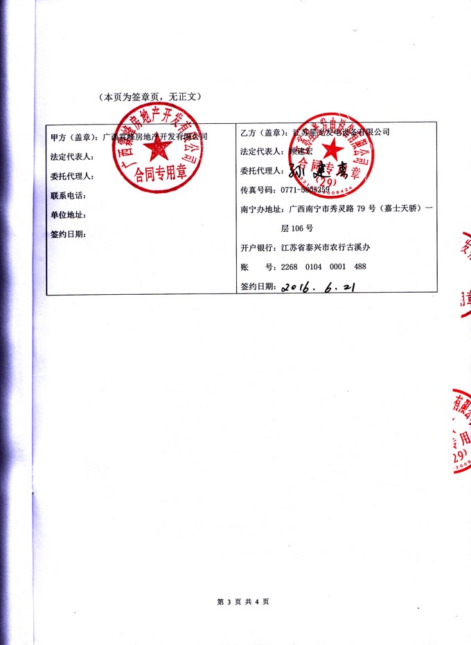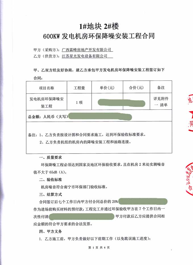 2016年6月21日 我公司与广西霖峰房地产开发有限公司成功签订1#块地2#楼600KW发电机房环保降噪安装工程合同,我公司为其提供一台柴油发电机组(机组配置为江苏里卡多发动机配星光发电机)的机房环保降噪除尘安装工程的工作,我公司负责工程所需材料购买、安装和油路连接,并保证工程达到环保验收标准要求。合同如下: