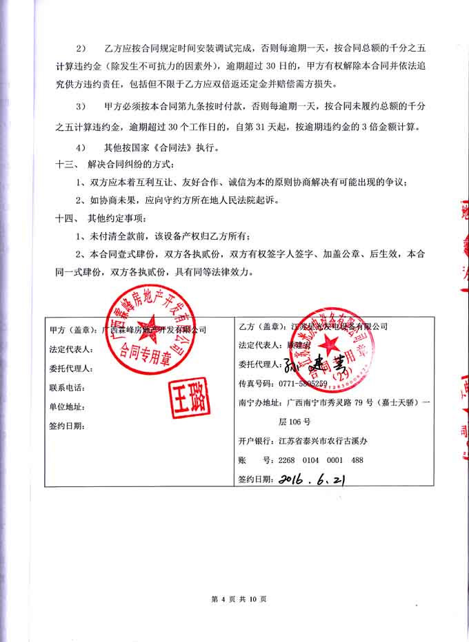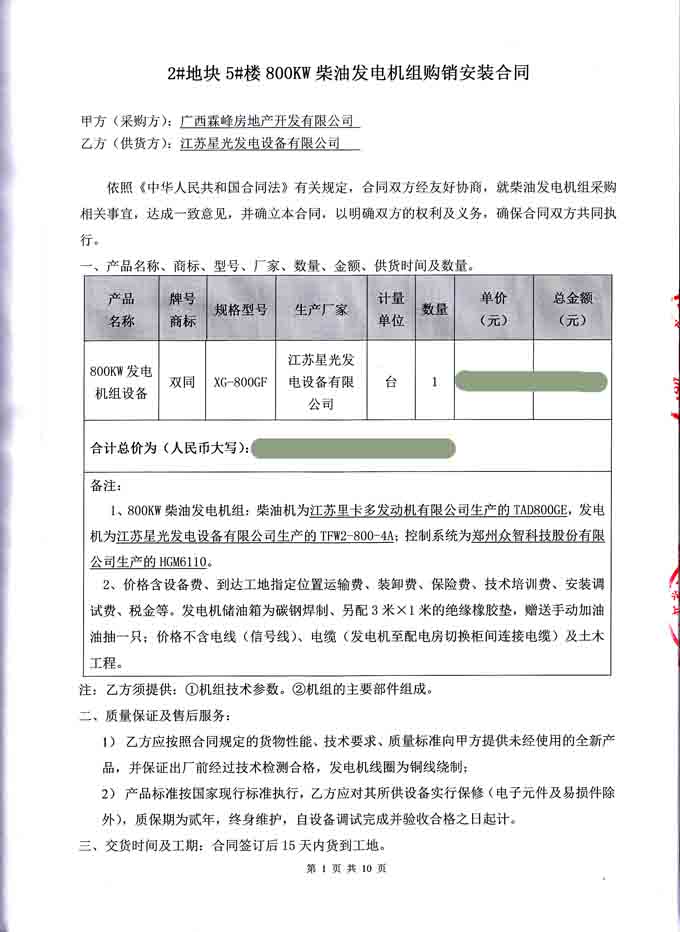 2016年6月21日,我江苏星光动力集团成功与广西霖峰房地产开发有限公司签订2#块地5#楼800KW柴油发电机组购销安装合同,我公司为其提供一台配置为为江苏里卡多发动机配星光发电机和众智控制器的发电机组,并负责机组的运输安装和调试工作及对发电机操作人员进行培训。发电机产品购销合同如下: