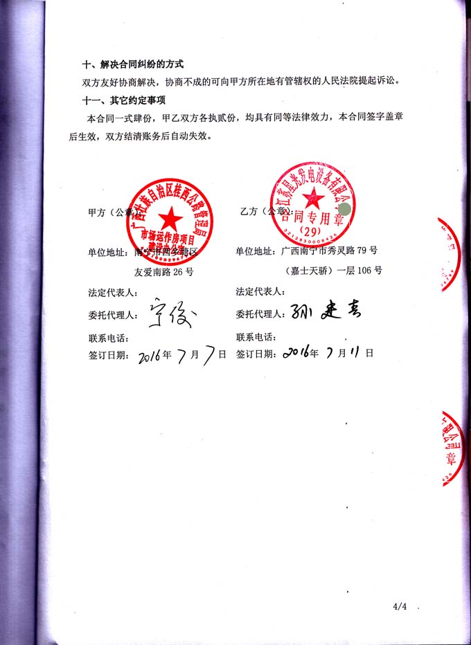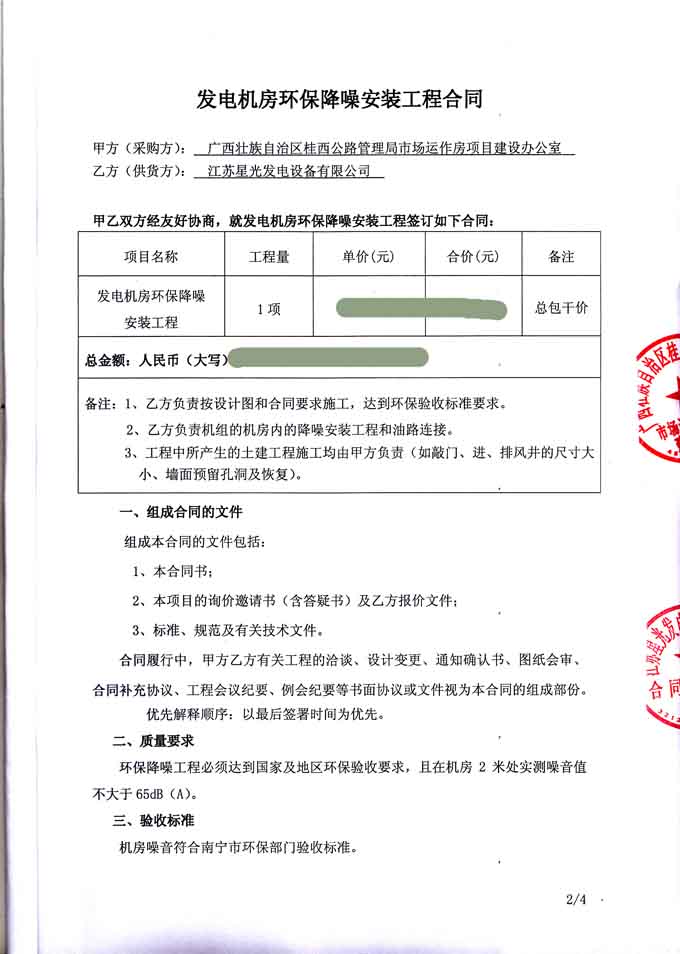 2016年6月29日,我公司与广西壮族自治区桂西公路管理局市场运作房项目建设办公室成功签订发电机房环保降噪安装工程合同,我公司负责为其提供一台400KW柴油发电机组机房内的降噪安装工程和油路连接,按照设计图和合同要求施工,达到环保验收标准要求等工作。合同如下: