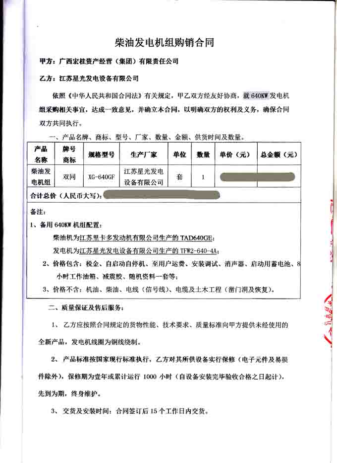 2016年5月25日,我公司与广西宏桂资产经营(集团)有限责任公司成功签订一台640KW柴油发电机购销合同,我公司为其提供配置为里卡多柴油机配星光发电机机组一台,并负责机组的运输及安装调试和操作人员的培训。发电机产品购销合同如下:
