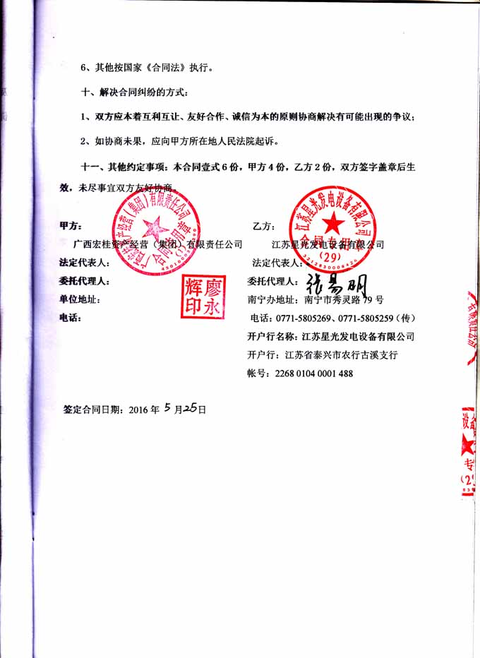 江苏星光动力集团 >> 新闻动态 >> 广西宏桂资产经营集团640KW里卡多发电机组购销合同
