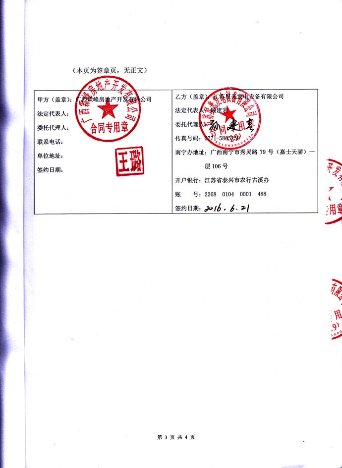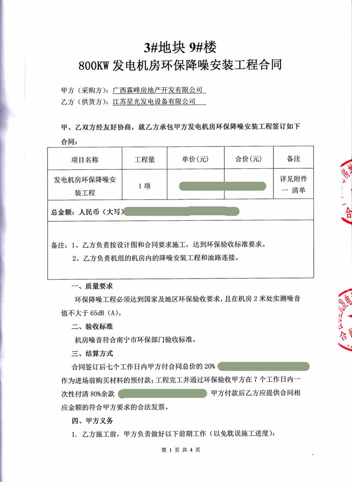 2016年6月21日 广西霖峰房地产开发有限公司与我公司签订3#块地9#楼 800KW发电机组 发电机房环保降噪安装工程合同,我公司为其提供一台里卡多柴油发电机组的发电机房环保降噪除尘安装工程的工作,负载工程所需材料购买、安装和油路连接,并保证工程达到环保验收标准要求。合同如下: