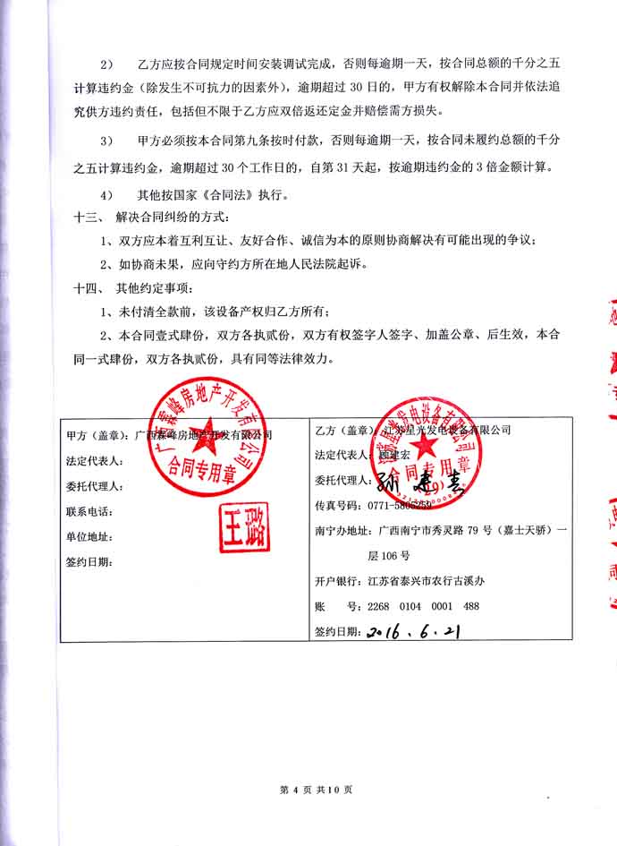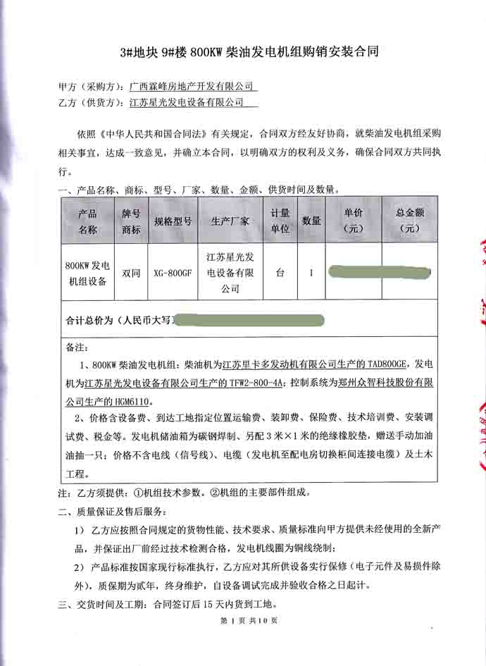2016年6月21日,广西霖峰房地产开发有限公司与我公司签订3#块地 9#楼柴油发电机组购销安装合同,我公司为其提供一台800KW发电机组,机组配置为江苏里卡多发动机配星光发电机。发电机产品购销合同如下: