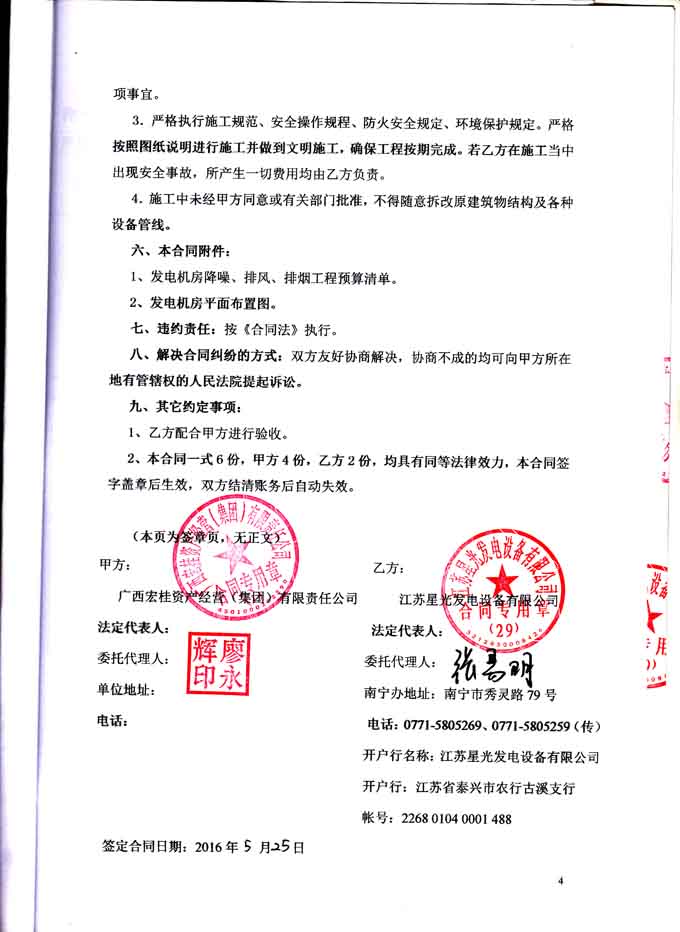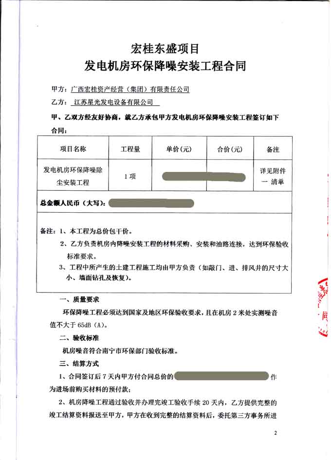 2016年5月25日 广西宏桂资产经营(集团)有限责任公司工程与我公司签订宏桂东盛项目发电机房环保降噪安装工程合同,我公司为其提供一台640KW里卡多柴油发电机组的发电机房环保降噪除尘安装工程的工作,负载工程所需材料购买、安装和油路连接,并保证工程达到环保验收标准要求。合同如下:
