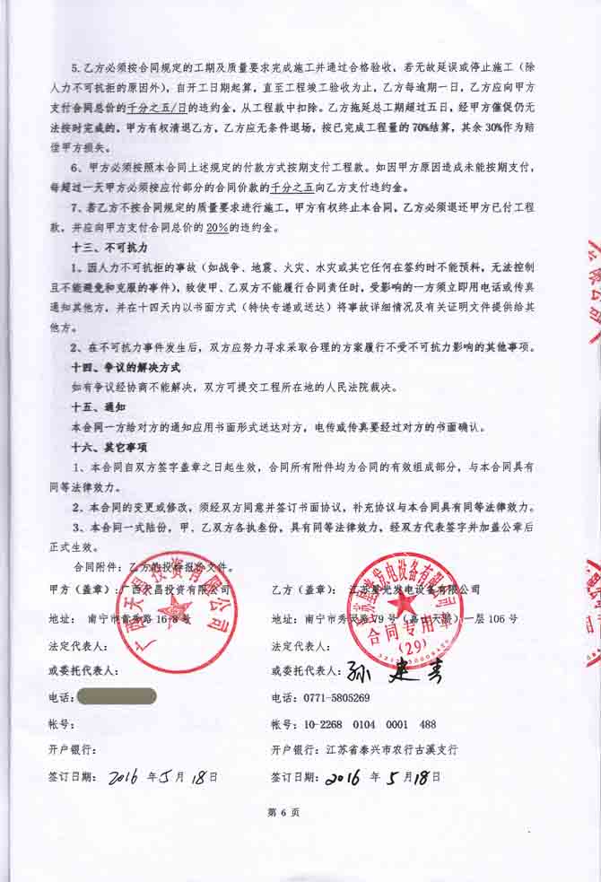 2016年5月18日,广西天昌投资有限公司与我公司签订东盟中央城C区发电机机房排烟降噪环保工程施工合同,我公司为其提供一台630KW康明斯发电机组的机房噪声、废气综合治理、环保工程及机房照明、排风工程的设计及施工。合同如下: