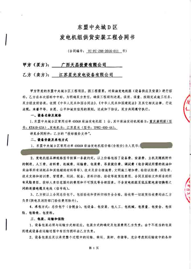 2016年5月18日,我公司自主创新设计生产的节能环保型柴油发电机借精湛的技术,优良的品质和完善的售后服务成功与广西天昌投资有限公司签订东盟中央城D区发电机组供货安装工程合同,我公司为其提供配置为重庆康明斯发动机配江苏星光发电机的400KW柴油发电机组一台。发电机产品购销合同如下: