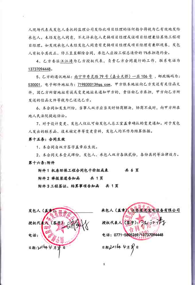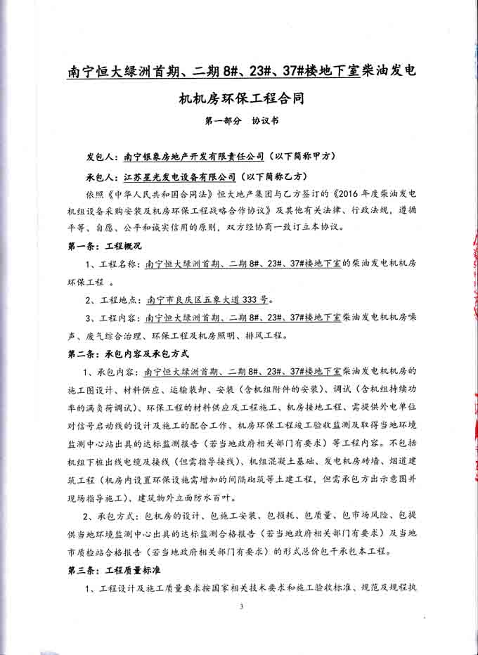 2016年4月29日,我公司与南宁银象房地产开发有限责任公司签订南宁恒大绿洲首期、二期8#、23#、37#地下室柴油发电机机房环保工程合同,我公司分别为其提供400KW发电机组、640KW柴油发电机组和800KW柴油发电机组的机房噪声、废气综合治理、环保工程及机房照明、排风工程。合同如下: