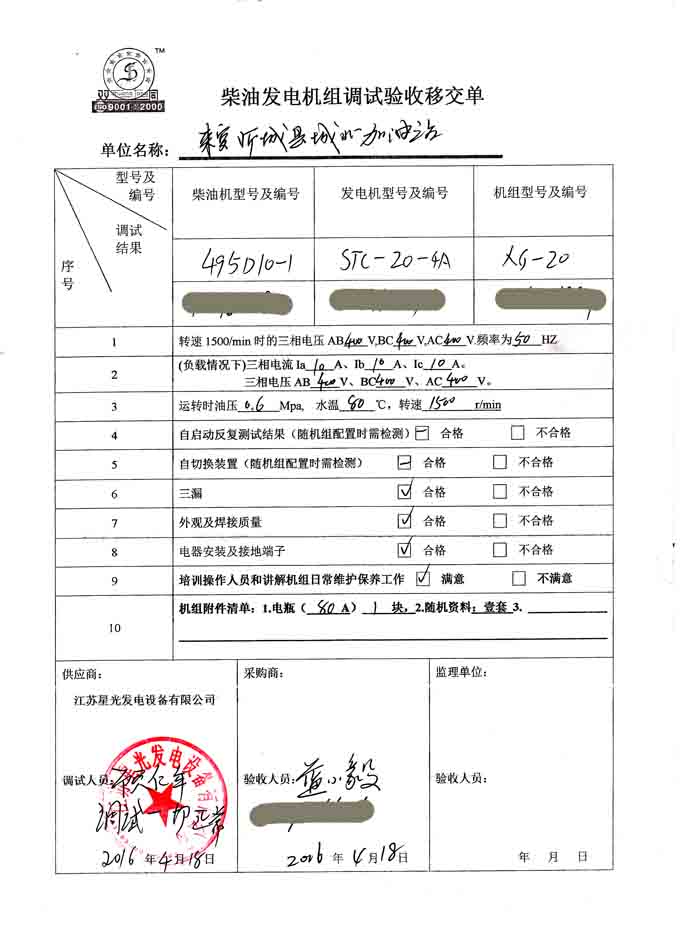 2016年4月18日,在来宾忻城城北加油站的发电机组安装现场,我司技术人员对柴油发电机组进行调试交付工作。之前来宾忻城城北加油站成功与我公司签订20KW潍柴柴油发电机组采购合同,此刻已经做好安装调试工作,并培训其操作人员和讲解机组日常维护保养注意事项,以下是发电机组调试验收单: