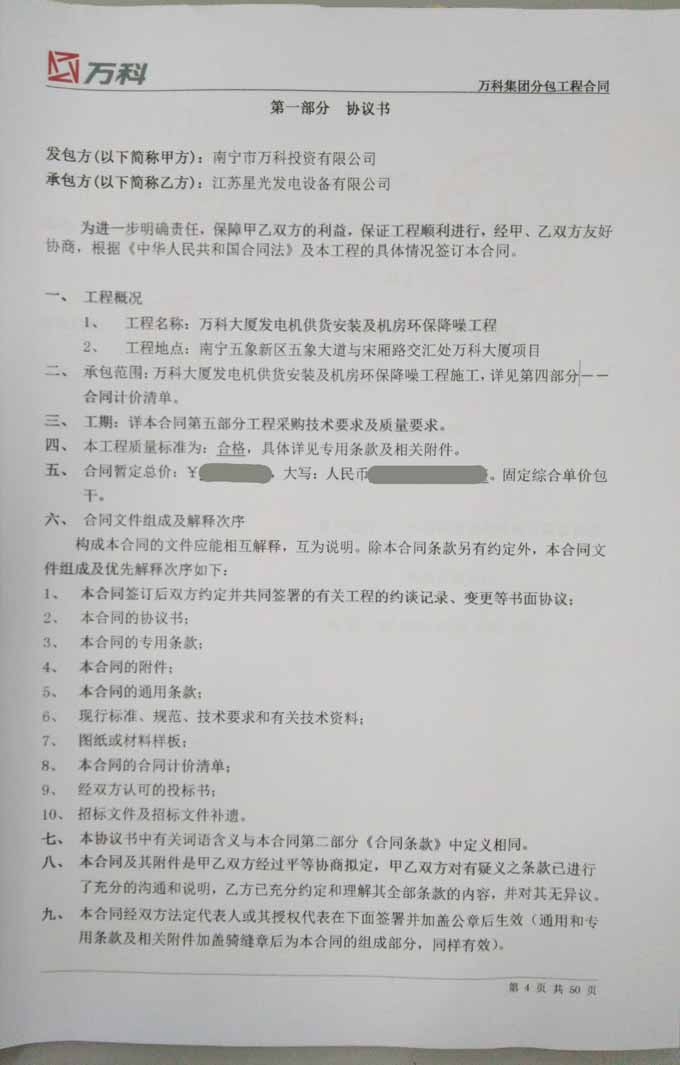 2016年4月9日,我公司凭借精湛的技术,良好的产品质量和完善的售后服务体系成功与南宁市万科投资有限公司签订万科大厦发电机供货安装及机房环保降噪工程合同,我公司为其提供630KW柴油发电机组(含减震装置和消音器)两台,机组配置为发动机:重庆康明斯柴油机KTA38-G2,发电机:广州英格发电机EG400-640N和郑州众智控制器。发电机产品购销合同如下: