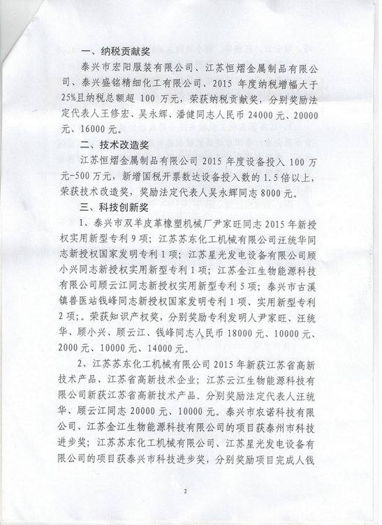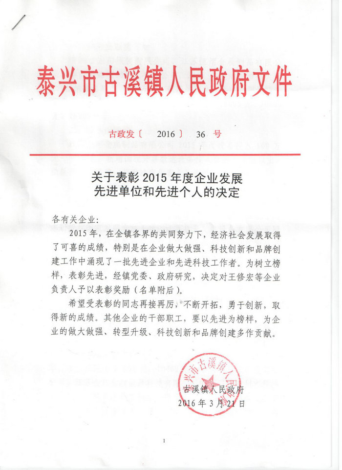 我公司在2016年3月21日的泰兴市古溪镇人民政府文件《关于表彰2015年度企业发展先进单位和先进个人的决定》中获得以下表彰: