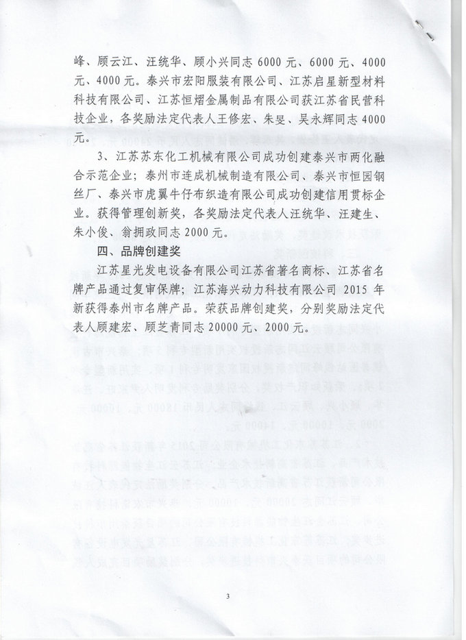 2、江苏星光发电设备有限公司“江苏省著名商标”、“江苏省名牌产品”通过复审保牌,荣获“品牌创建奖”。
