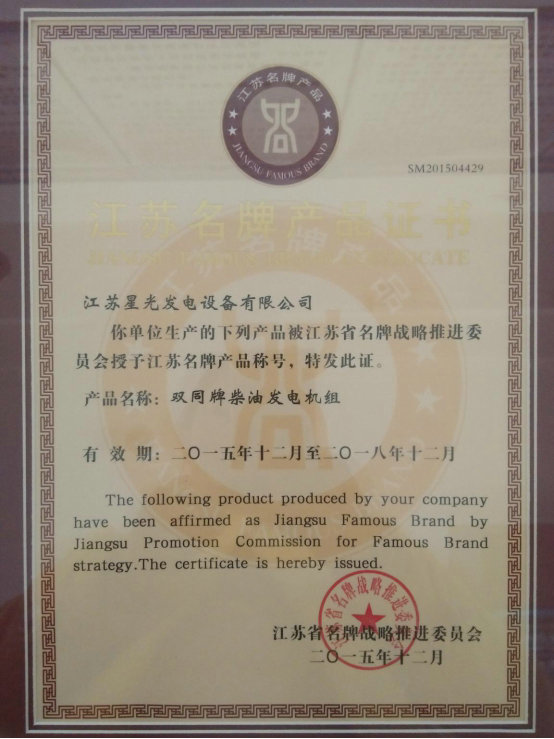 2016年2月26日由江苏省名牌战略推进委员发布的文件《江苏省名牌战略推进委员会关于公布2015年江苏名牌的决定》中我公司“双同”牌发电机组榜上有名。"江苏名牌产品"称号,看似"无形"实为"有形"的知识产权,具有巨大的含金量。