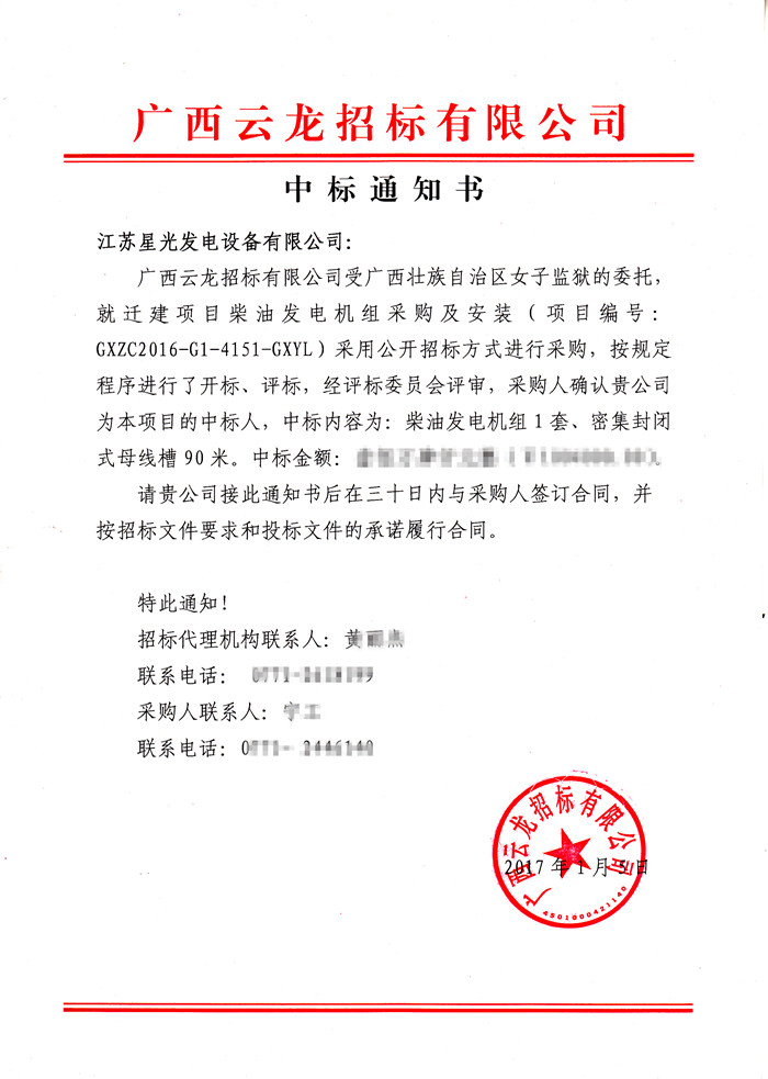 2017年1月9日,我公司又传来中标喜讯,收到招标公司关于广西壮族自治区女子监狱的中标通知书。中标机组品牌为:里卡多柴油发动机配星光发电机,功率为1000KW。我公司将于30天内与该用户签订合同,并按照招标文件要求和投标文件的承诺履行合同。
