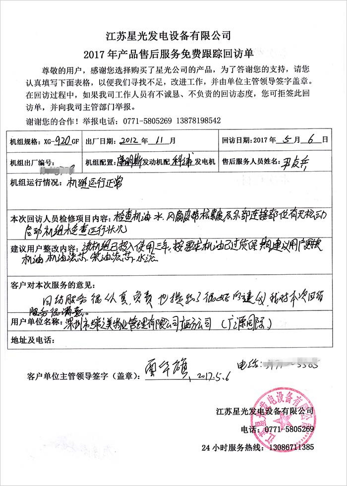 江苏星光动力集团 >> 服务跟踪 >> 我公司为深圳市缔之美物业管理公司920KW康明斯发电机组免费售后跟踪回访