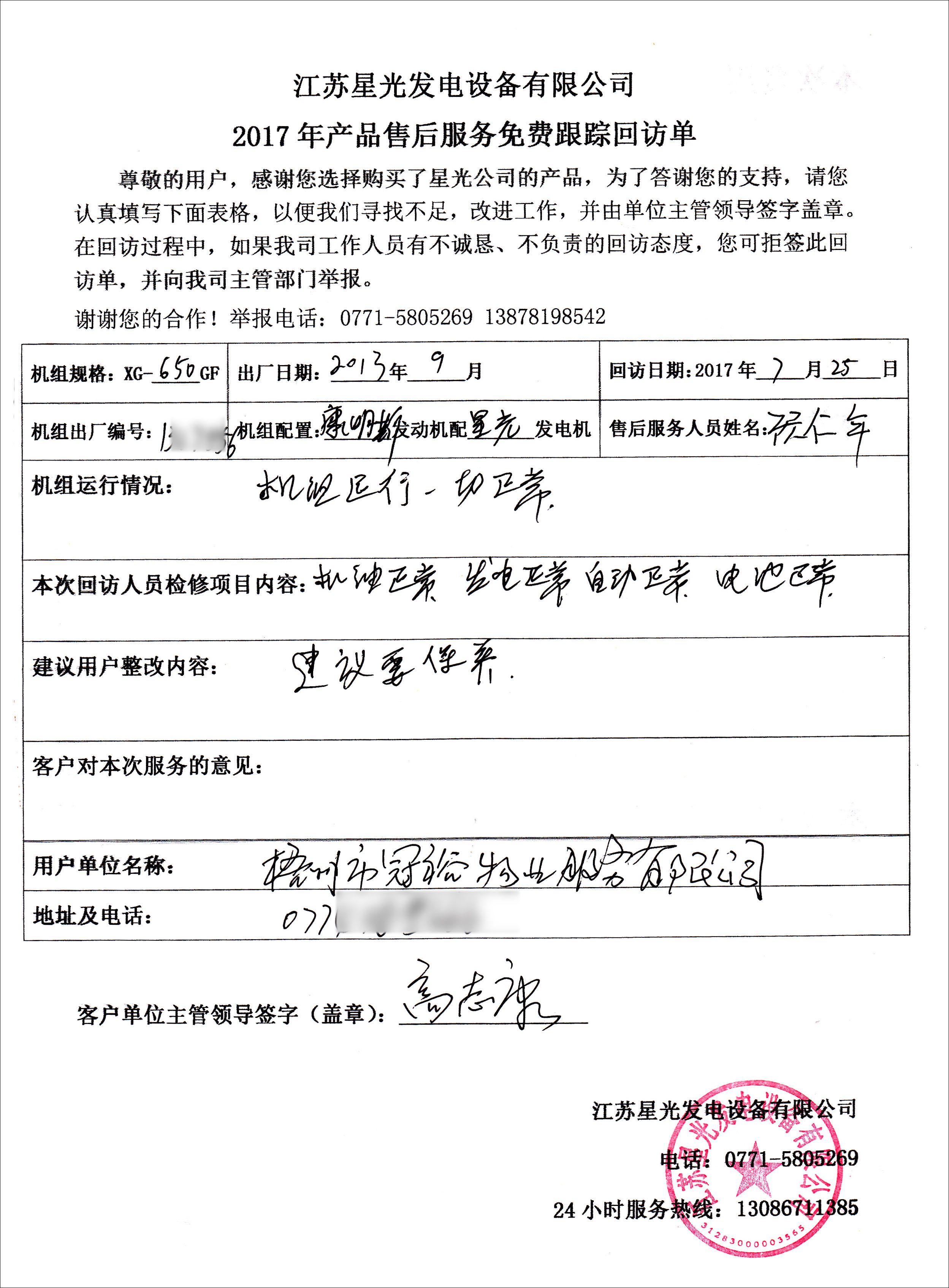 7月25日,我公司售后技术员顾师傅到梧州冠裕物业公司对其于2013年9月在我司购买的两台康明斯发电机组进行免费售后回访服务。顾师傅检查了机油、电池及机组自动化、发电情况均正常。因机组已使用较长时间,顾师傅建议对机组进行保养,以确?;檎T诵?。更多关于康明斯发电机组售后服务欢迎拨打星光热线:13878198542