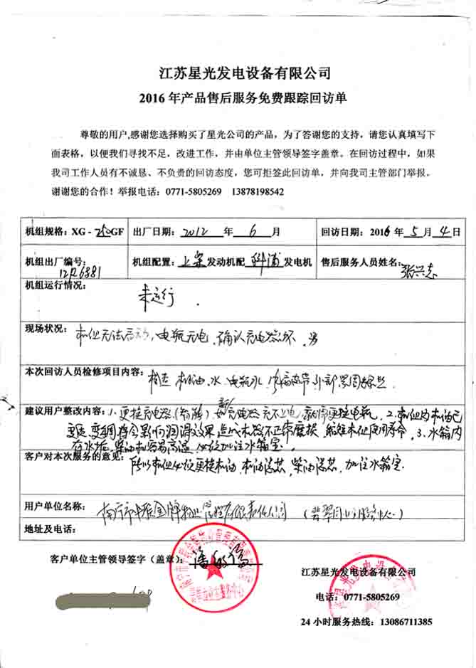 2016年4月29日,我公司技术服务人员到翡翠园,就南宁市中联金牌物业管理有限责任公司向我公司购买的250KW柴油发电机组进行免费回访。本次回访发现机组无法启动,电瓶无电,经确认,发电机组为充电器烧坏。技术人员还检查了机组的机油、水箱水、电瓶水和风叶皮带、外部坚固螺丝等部件,并针对机组出现的问题给出建议。下面是本次回访记录: