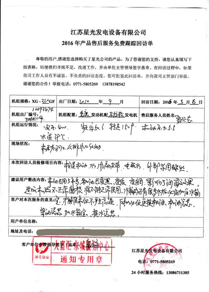 2016年5月6日,我公司技术人员到大嘉汇东城服务中心进行发电机组免费回访。本次回访的机组是2010年我公司为其提供的重庆康明斯柴油机配马拉松发电机的320KW发电机组。技术人员启动机组检查机油、水箱水、风叶皮带、电瓶水、外部坚固螺丝等部件,并针对机组目前的运行状况给出建议。下面是本次回访记录: