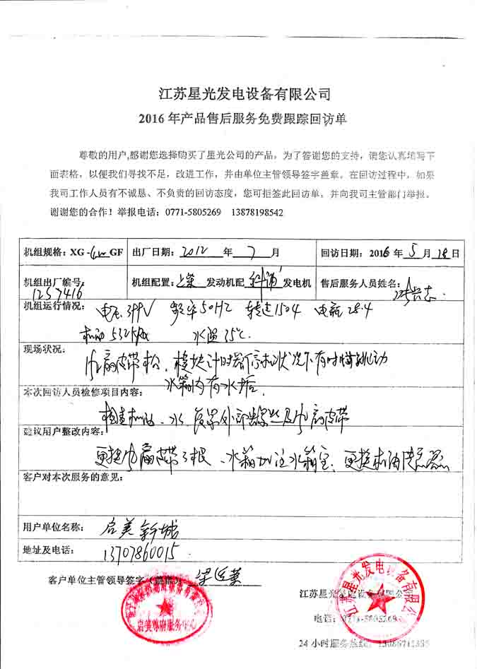 2016年5月18日,我江苏星光动力集团售后人员到南宁市温馨园物业服务有限公司的金象绿城一区及启美新城发电机房,对其向我公司购买的300KW柴油发电机组和400KW发电机两台上柴发电机组进行免费回访。