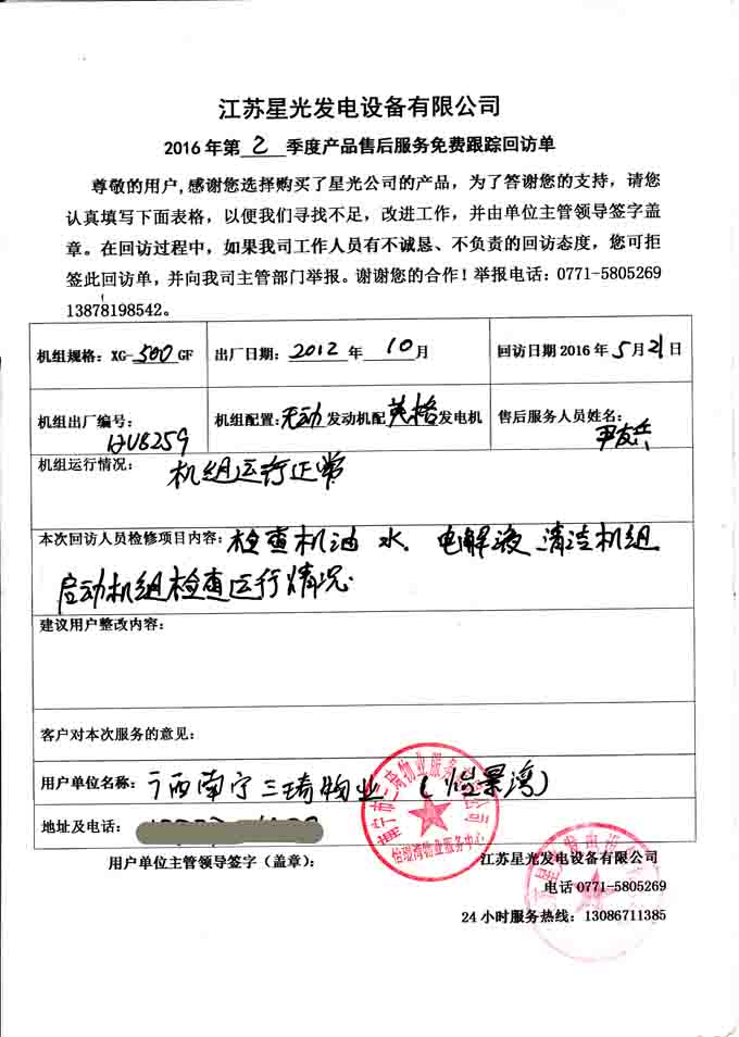 江苏星光动力集团 >> 服务跟踪 >> 南宁市三琦物业(怡景湾)500KW无动发电机组免费回访记录