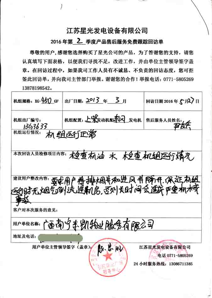 2016年5月27日,我公司售后服务人员到东凯商业广场,对广西南宁东凯物业服务有限公司向我公司购买的450KW上柴柴油发电机组进行免费回访。
