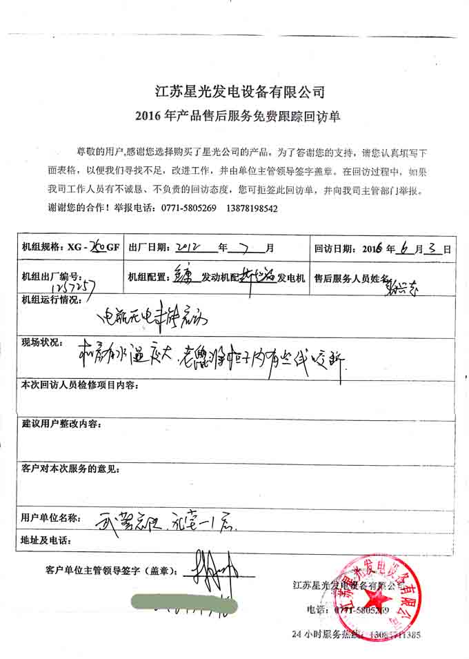 2016年6月3日,我星光动力集团售后技术人员到广西武警总队,对我公司为其提供的两台250KW发电机组进行免费回访。技术人员检查机组的机油、水箱水、风扇皮带等附件设备,启动机组,发现一台未能启动,老鼠将柜子内的部分线咬断。最好技术人员建议用户做好机组维护和发电机房的清洁工作,解决机房湿度大等问题。下面是本次回访记录: