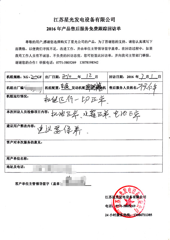 对于发电机售后服务,江苏星光发电设备有限公司可提供售前售后一条龙服务,我公司的发电机设计稳重,巧妙,质量合格,耐用,价格公道,符合市场需求,在供应康明斯发电机,沃尔沃发电机,里卡多发电机,玉柴发电机等也是市场上用户的需求,同时也是江苏星光动力集团供应发电机中销量最好的发电机,以下是2016年7月1日,本公司售后服务人员回访记录单: