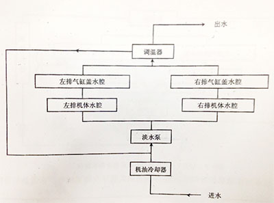 开式循环冷却系统即柴油发电机组的进出水口为开式,使用时由用户自行接通水源。根据柴油发电机组机型和机油冷却器的布置不同,组成开式循环冷却系统的型式亦稍有区别。其冷却液流向如图1,图2所示。