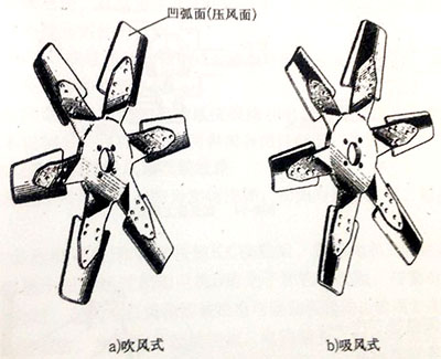 柴油发电机组工作时,按其旋转方向,根据风叶的凹弧面应为压风面的原则采判断风扇是吹风式还是吸风式,例如面向柴油发电机组前端看,如果风扇的压风面(凹弧面)面向您时,即为吹风式;反之非压风面(凸弧面)面向您时则为吸风式(如图2所示)。安装风扇时切勿装反,否则风叶的非压风面将成为压风面,影响风扇风量,使散热器的散热效果下降。