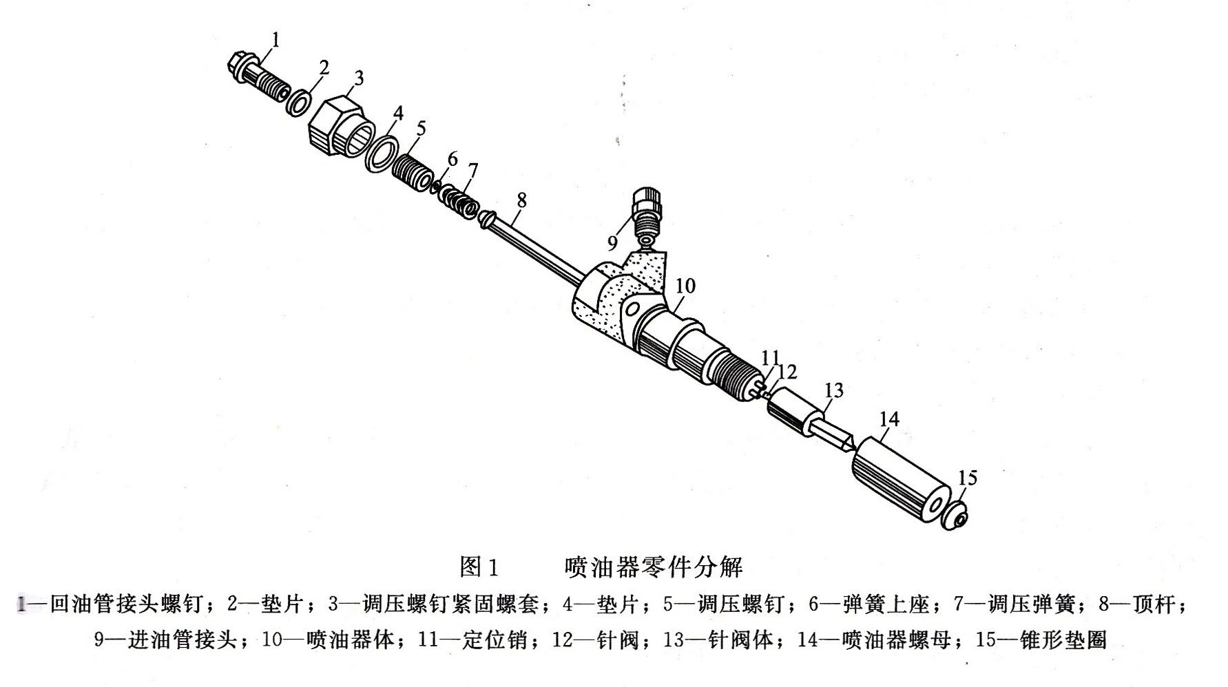 2、装配时,先旋进有滤芯的进油管接头,紧压铜垫圈达到密封不漏油。然后将调压弹簧和顶杆放进喷油器中,旋入调压螺钉,直到刚接触调压弹簧为止,再旋上调节螺母。