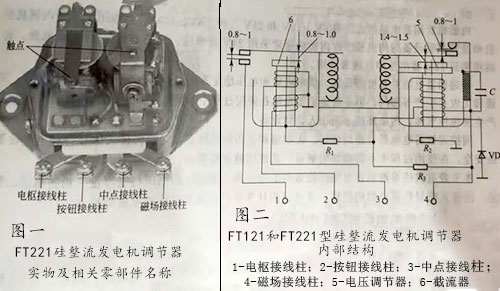 ③检查各触点间隙和气隙(FT221型硅整流发电机调节器实物图和相关触点的间隙如图一和图二所示),若不符合要求,应进行调整。