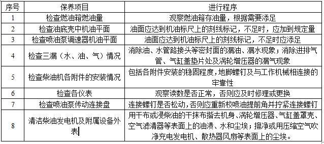 无论进行何种保养,都应有计划、有步骤地进行拆检和安装,并合理地使用工具,用力要适当,解体后的各零部件表面应保持清洁,并涂上防锈油或油脂以防止生锈;注意可拆零件的相对位置,不可拆零件的结构特点以及装配间隙和调整方法。同时应保持柴油发电机及附件的清洁完整。
