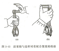 对柴油发电机组的柴油机而言,一般的检验方法是:将活塞销涂以机油,能用手掌的力量把活塞销推入连杆衬套,并且没有间隙的感觉,则认为松紧度为合适【图3-43(a)】对汽油机而言,一般的检验方法是:将活塞销涂以机油,能用大拇指的力量把活塞销推入连杆衬套,并且没有间隙的感觉,则认为松紧度为合适【图3-43(b)】;接触面积在75%以上,并且接触点分布均匀,轻重一致,则认为接触面符合要求。