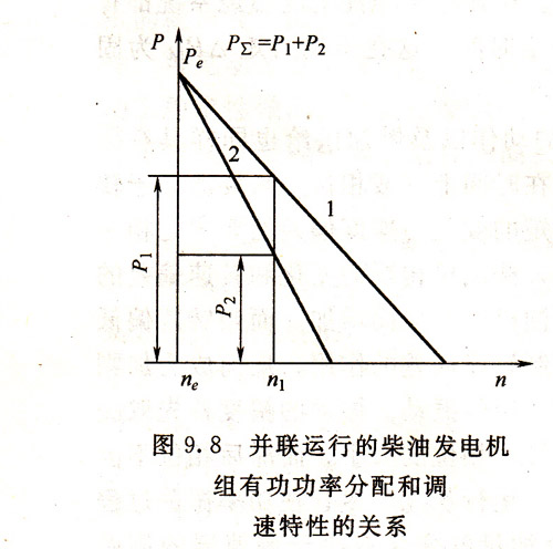 任意一台机组的调速特性为Pi=fin),式中i=1,2,3,...m;P柴油机发电机组的功率;n是转速。整个电    网的调速特性为∑Pi =f1n+f2n+…,式中∑Pi为整个电网的总负载功率(图9.8)。当电网负载∑Pi为一定时,整个电网的频率和每台发电机组的功率也就确定了。其功率分配是不均匀度δ大的那台柴油发电机所承担的负载大,不均匀度δ小的那台柴油发电机所承担的负载小。