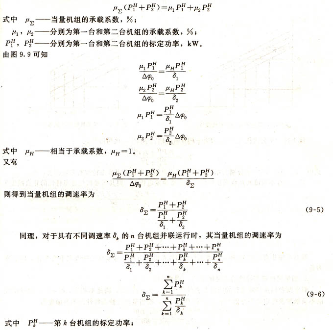 假定两台机组调速特性的非直线度r1 =r2=0,调速器的不灵敏度ε1=ε2 =0,调速率分别为δ1、δ2;标定功率分别为pH 1、pH 2,则这两台机组并联运行时当量机组的调速率计算如下。