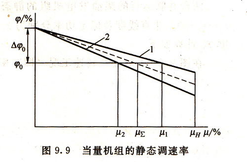 图9.9为两台同步并联运行机组的静特性。1为第一台机组的特性,2为第二台机组的特性。纵坐标是频率的百分比,横坐标是负载的百分比。