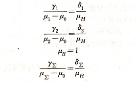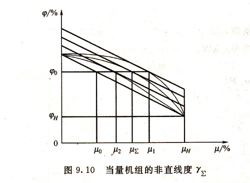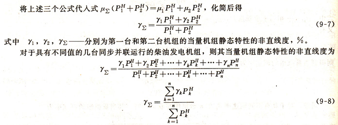 两台并联运行的柴油发电机组的静态调速假定相等,不灵敏度也相等并为零。即δ1=δ2,ε1=ε2 =0。非直线度及标定功率分别为γ1、γ2托和pH 1、pH 2,则当量机组的静态调速特性的非直线度γ∑计算如下。