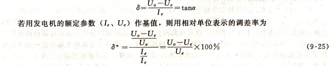 在一般情况下,调压特性是一条U=f(I)的曲线。I为发电机的无功电流,如图9.16中的曲线。在图9.16中,Ie为发电机的额定无功电流,U0及Ue分别为发电机空载时及额定无功负载的电压。为了方便起见,通常用一条直线(图中的曲线2)近似地取代曲线1,并用以下参数表征调压特性。