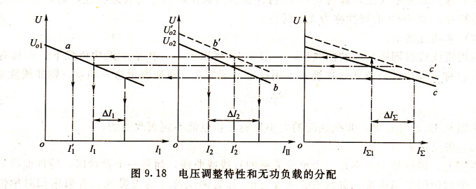 假定两台发电机的调压特性分别为U=f(I1)和U=f(I2),其调差率和空载电压分别为δl、δ2U01、U02,如图9.18中的特性ab所示。根据并联运行时发电机电压严一致的原则,把每一电压下两特性的横坐标相加,就可得到两台发电机总的调压特性,或称电站的调压特性U=f(I),如图9.18中的特性c。根据电站的调压特性c,就很容易求出电站在任一无功负载I下发电机的电压U和每台发电机的无功电流I1及I2。同样,还可求出在这一工况下,负载总无功电流增加△I后,两台发电机无功电流的增量△I1及△I2