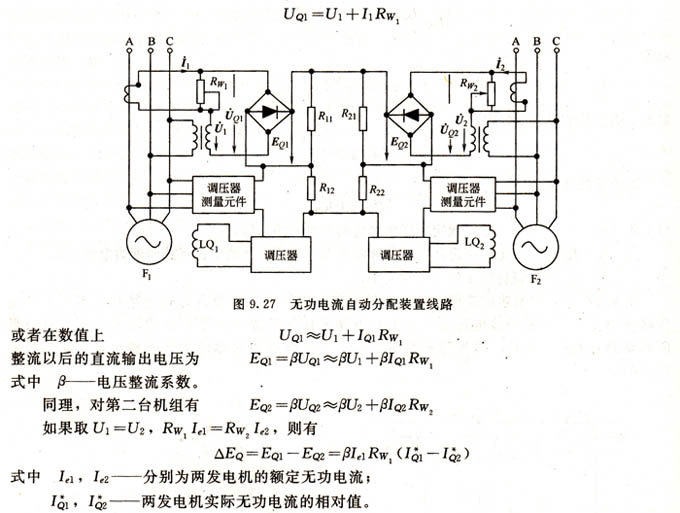 9.27是这种装置的线路图。该电路首先把两台发电机的无功电流加以检测比较,作用原理和前面的无功电流调整装置完全相同。例如,对于第一台发电机,整流桥前的交流电压为