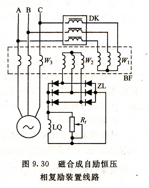 图9.30是磁合成的自励恒压线路图,图中DK为三相线性电抗器,又称移相电抗器;BF为三相三绕组变压器,W1BF的电压绕组,W2为输出绕组,W3为其电流绕组;ZL为三相桥式整流器,忌为调整变阻器,LQ发电机的励磁绕组。