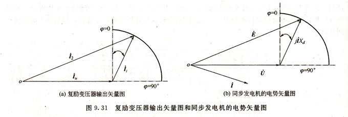 现在把励磁电流I2的矢量图和发电机的电势矢量图做一个比较。图9.31(b)是发电机电压不变的条件下,不同负载电流和功率因数时的发电机电势简化矢量图,比较图9.31 (a)、9.31(b)两图可以看出,发电机的励磁电流I2和发电机电势它的变化规律是完全一致的。这就说明,由于励磁的复励分量和电压分量进行矢量叠加的结果,励磁电流能够在原理上满足发电机电势变化的要求,使发电机电压保持恒定,相复励自励恒压的名称也即由此而来。