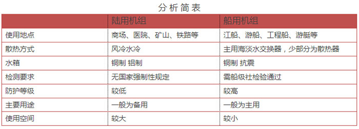 此外,船用机组分主机和辅机,大多数情况要求多机并联,陆用机组视具体情况相对简单,两者使用条件也不一样,船用发电机组是在内陆河流或海洋上运行使用,因此防水、防潮、防盐碱、抗冲击、抗颠簸的能力有强制要求。