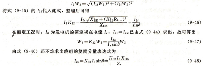 将式(9-43)和式(9-48)加以合并,就可得到复励变压器输出电流的完整表达式。不过要注意,电压分量I2o已经在相位上滞后发电机电压δ(δ90°),也即I2oI2i的相位关系应该和图9.31(a)所表示的相一致??悸堑秸庖惶氐悖⒌缁睦诺缌骺杀硎疚?/span>